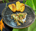 Queijo brie na pedra quente com mel, mix de nuts e pão caseiro.