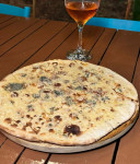 Massa de fermentação lenta, queijo mussarela, molho de tomate feito com tomate pelado e tomate confit e pesto de manjerição.